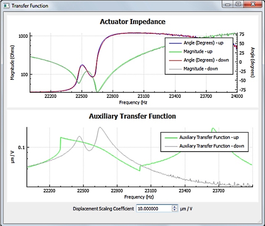 The built-in swept-sine frequency response analyzer (shown below) allows the actuator's electrical and mechanical response to be characterized. This feature is particularly useful for transducer development, troubleshooting, and health monitoring in industrial machinery.