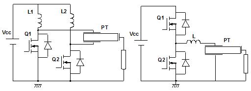 The general schematic adopted to drive a PT is illustrated in Figure 2. A DC-voltage is converted into a square wave voltage, which is applied to the piezoelectric transformer. The generated voltage at the output is supplied to the load. Depending on the application it may be rectified first. Work on different resonant switching converters topologies have been published, including push-pull, half-bridge, full-bridge and flyback. Figure 2 shows the two more common topologies presented in commercial applications, the push-pull and the half-bridge. From all of them, the standard approach used for step-up applications has been the push-pull topology, since allow higher step-up ratios than half-bridge and has a simpler driving control circuit for the transistors gates. However, half-bridge has been generally adopted for power applications in the recent publications.