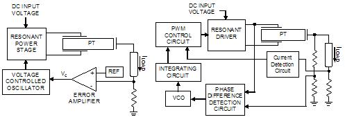 The second type of control is similar, however, typically the output current is detected by a resistor and converted into a direct current level by a rectifying circuit to control the driving frequency control. To this type of control correspond the family UCC3975, 6, 9 of IC driving circuits for PTs developed by Texas Instruments and available commercially since late 2001.